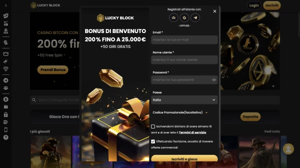 Creare un account richiede solo pochi minuti e i passaggi sono gli stessi sia che tu preferisca EUR sia crypto. Su LuckyBlock, puoi aprire il tuo account LuckyBlock Casino, impostare i tuoi dati e poi decidere se attivare le promozioni prima di giocare. I giocatori che cercano un bonus senza deposito LuckyBlock casino dovrebbero sapere che le nostre offerte principali sono legate al deposito e che eventuali ricompense speciali senza deposito vengono mostrate solo nell’area promo con termini chiari.
