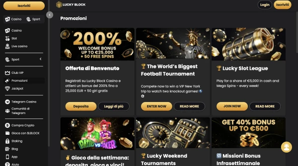 Manteniamo le promo ricorrenti facili da trovare, così puoi pianificare le sessioni senza tirare a indovinare. Monday Reload è attivo ogni settimana e offre fino a un 40% di match sul deposito ogni lunedì, mentre Game of the Week ruota settimanalmente aggiungendo free spins su una slot in evidenza. Midweek Mission è anch’essa settimanale e utilizza sfide semplici, come completare task su giochi selezionati, per sbloccare ricompense. Se stai cercando un bonus senza deposito LuckyBlock casino, controlla l’area Promozioni, perché eventuali condizioni speciali verrebbero elencate lì con i passaggi esatti. Per molti giocatori, un calendario bonus LuckyBlock costante è il più utile perché puoi scegliere il giorno e il gioco che si adattano al tuo stile.