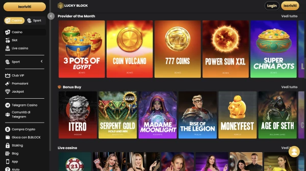 Per i giocatori che cercano nello specifico contenuti casino LuckyBlock slot, la nostra lobby slot è progettata per aiutarti a confrontare rapidamente volatilità e funzioni, usando filtri per provider e riquadri gioco chiari.